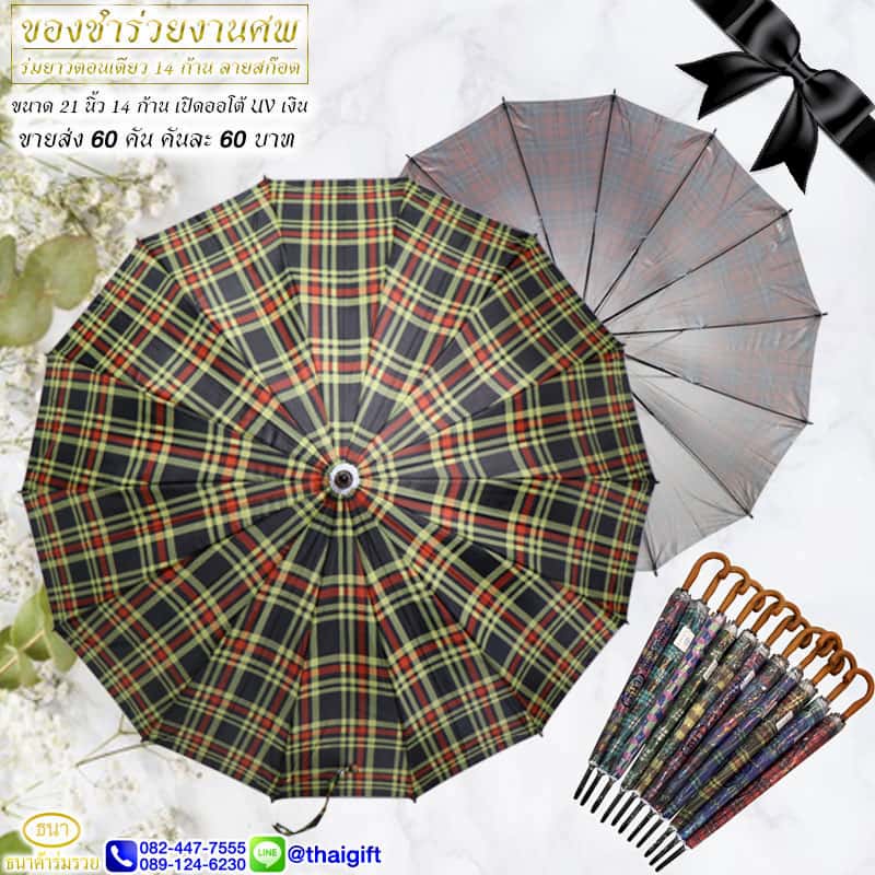 ของชำร่วยงานศพ ร่มยาวตอนเดียว ลายสก๊อต เหลืองเทา
